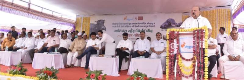 कोल्हापूर जिल्हा सहकारी दूध उत्पादक संघ (गोकुळ) व एनडीडीबी.डेअरी सर्व्हिसेस, नवी दिल्ली यांच्या संयुक्त विद्यमाने गडहिंग्लज तालुक्यातील लिंगनूर येथे उभारण्यात आलेल्या जातिवंत मुऱ्हा, मेहसाणा,जाफराबादी म्हैशी विक्री केंद्राचे उद्घाटन रविवारी करण्यात आले. मंत्री मुश्रीफ यांच्या हस्ते व पालकमंत्री प्रकाश आबिटकर, आमदार सतेज पाटील, माजी आमदार राजेश पाटील, गोकुळचे चेअरमन नवीद मुश्रीफ यांच्या प्रमुख उपस्थितीमध्ये हा कार्यक्रम झाला.